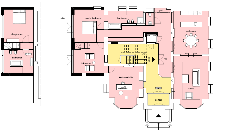Het appartement beschikt over de mogelijkheid tot het creëren van een royale leefkeuken en salon, een tuinkamer en 2 slaapkamers, eventueel beide voorzien van een eigen badkamer (naar wens in te vullen). De tweede ruime slaap- en badkamer ligt op de tussenverdieping, welke vanaf de begane grond met een trap vanuit de tuinkamer bereikbaar is.