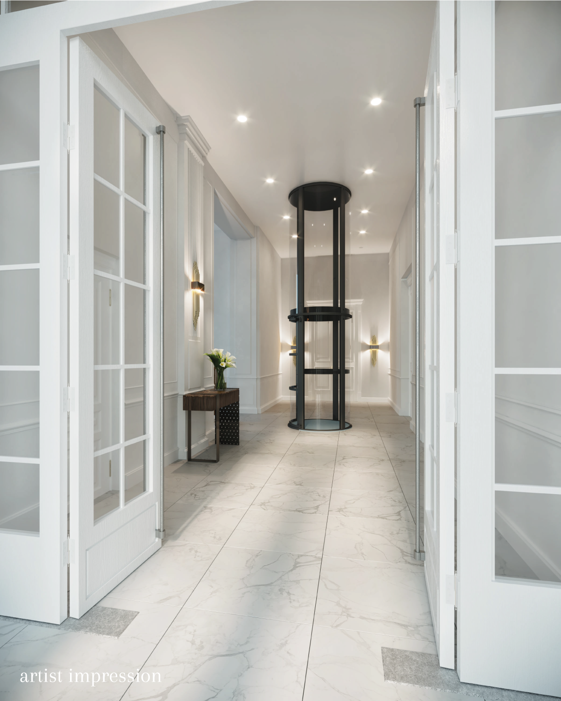 Het appartement is bereikbaar via de monumentale hoofdentree en de centrale hal met lift en het trappenhuis.